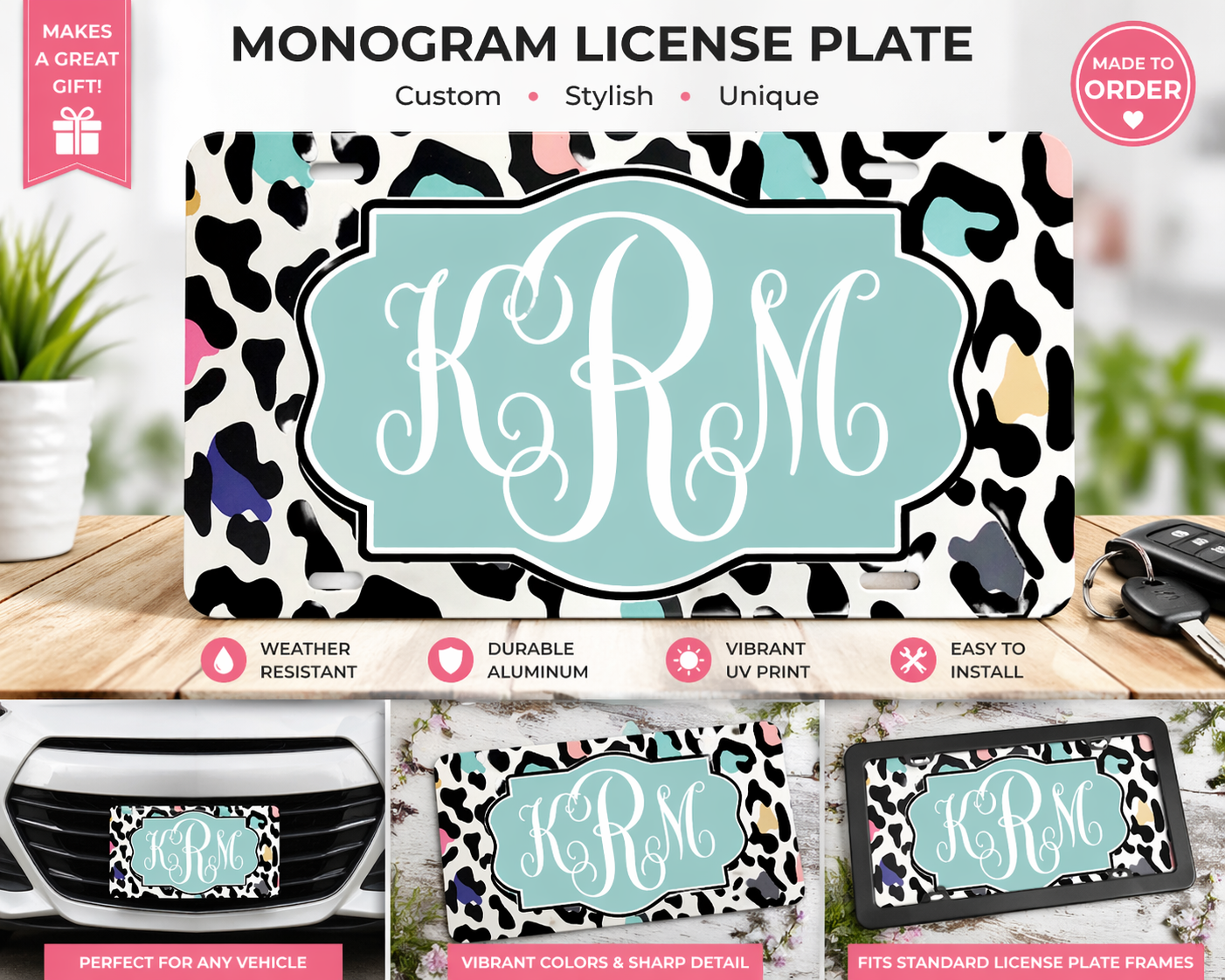 Turn heads with this bold and stylish personalized license plate! Featuring a fun cow print / animal print background with a soft teal monogram center, this design is the perfect mix of trendy and unique.