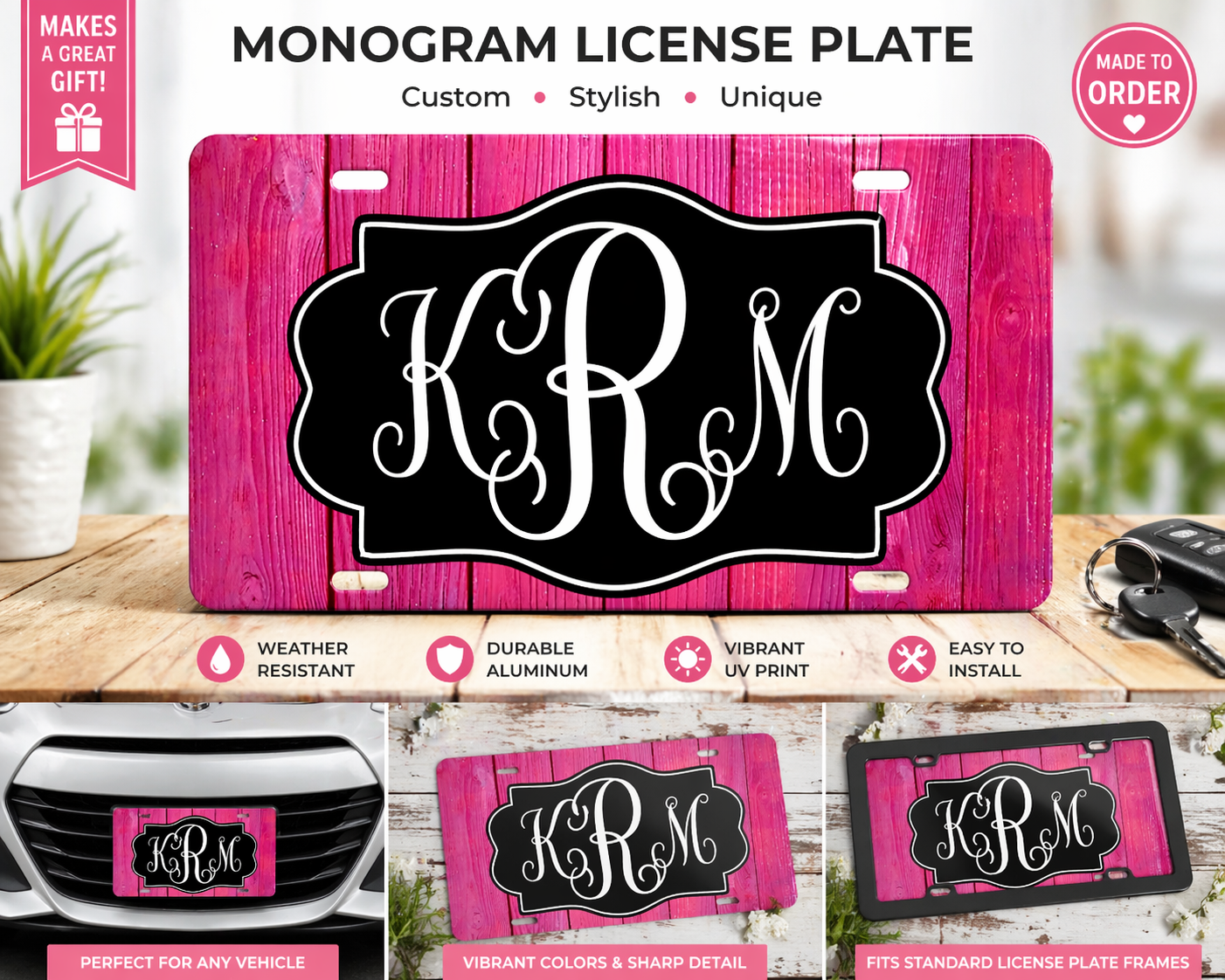 This version features a vibrant pink wood plank background paired with a classic monogram center—giving it a rustic yet stylish look that really pops.